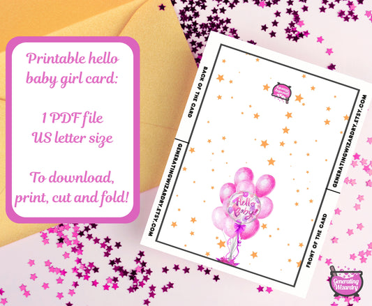 Printable Baby Hello Girl 7x5 inch card Instant download