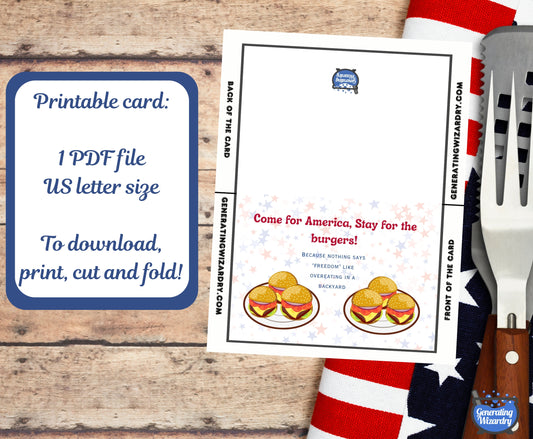 Printable Fourth of July Stay for the Burgers 7x5 inch card Instant download